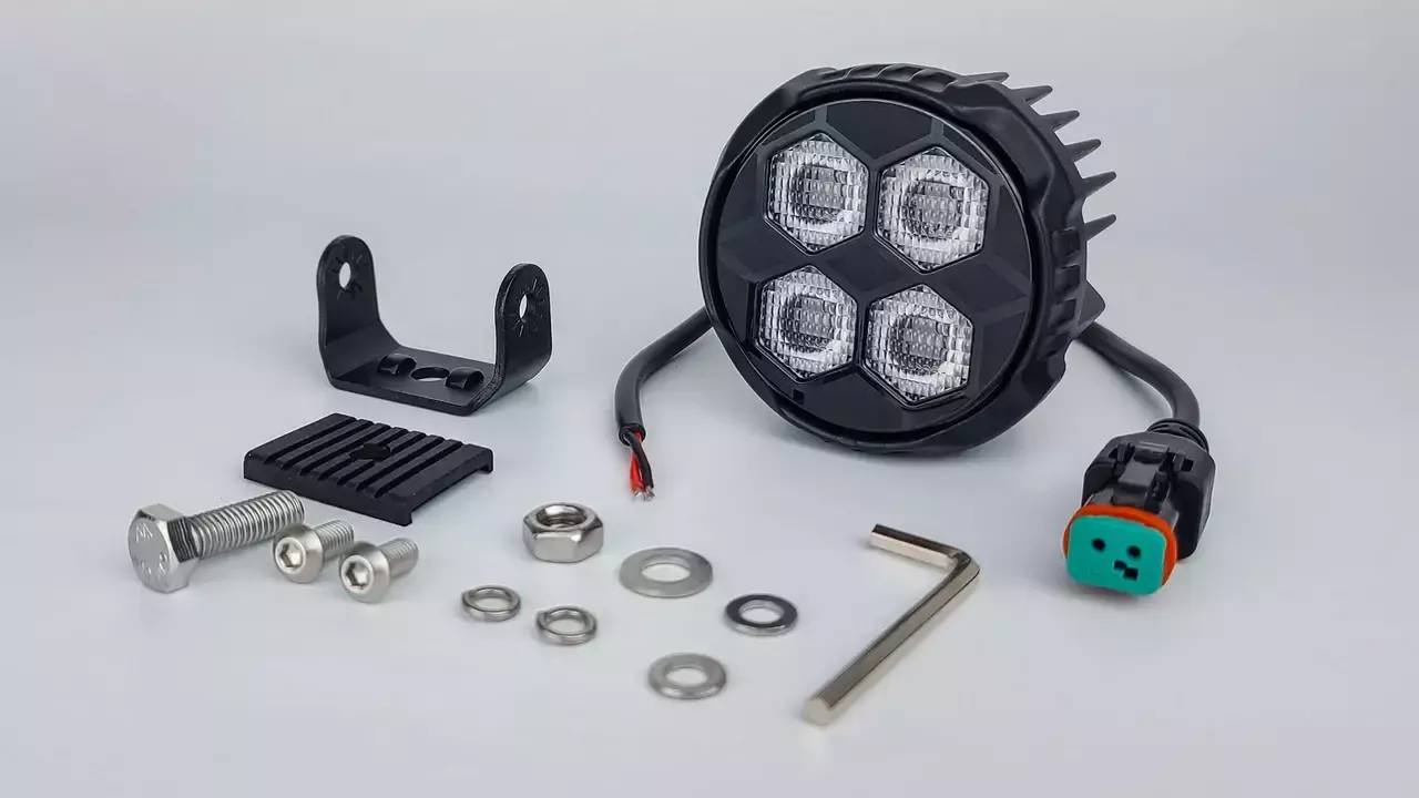У комплект включено фару, дріт з водонепроникним роз'ємом та кріплення для зручного встановлення.