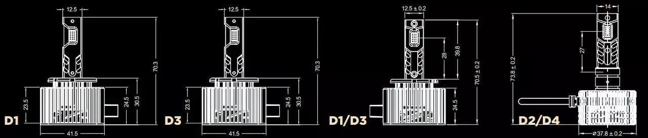 LED лампи D серії DLX - це продукт, який надає чітку світлотіньову межу та має вбудований модуль CAN-BUS обходу для уникнення помилки бортового комп'ютера на більшості автомобілів. Ось докладні характеристики цих ламп:
